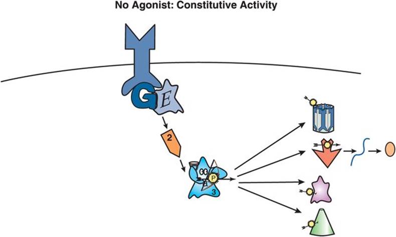 On the other hand, it is also possible that full agonist action can be too much of a good thing and that maximal activation of the signal transduction cascade is not always desirable, as in states of overstimulation by neurotransmitters. In such cases, blocking the action of the natural neurotransmitter agonist may be desirable. This is the property of an antagonist. Antagonists produce a conformational change in the G-protein-linked receptor that causes no change in signal transduction – including no change in whatever amount of any constitutive activity that may have been present in the absence of agonist (compare Figure 2-4 with Figure 2-6). Thus, true antagonists are “neutral” and, since they have no actions of their own, are also called “silent.”