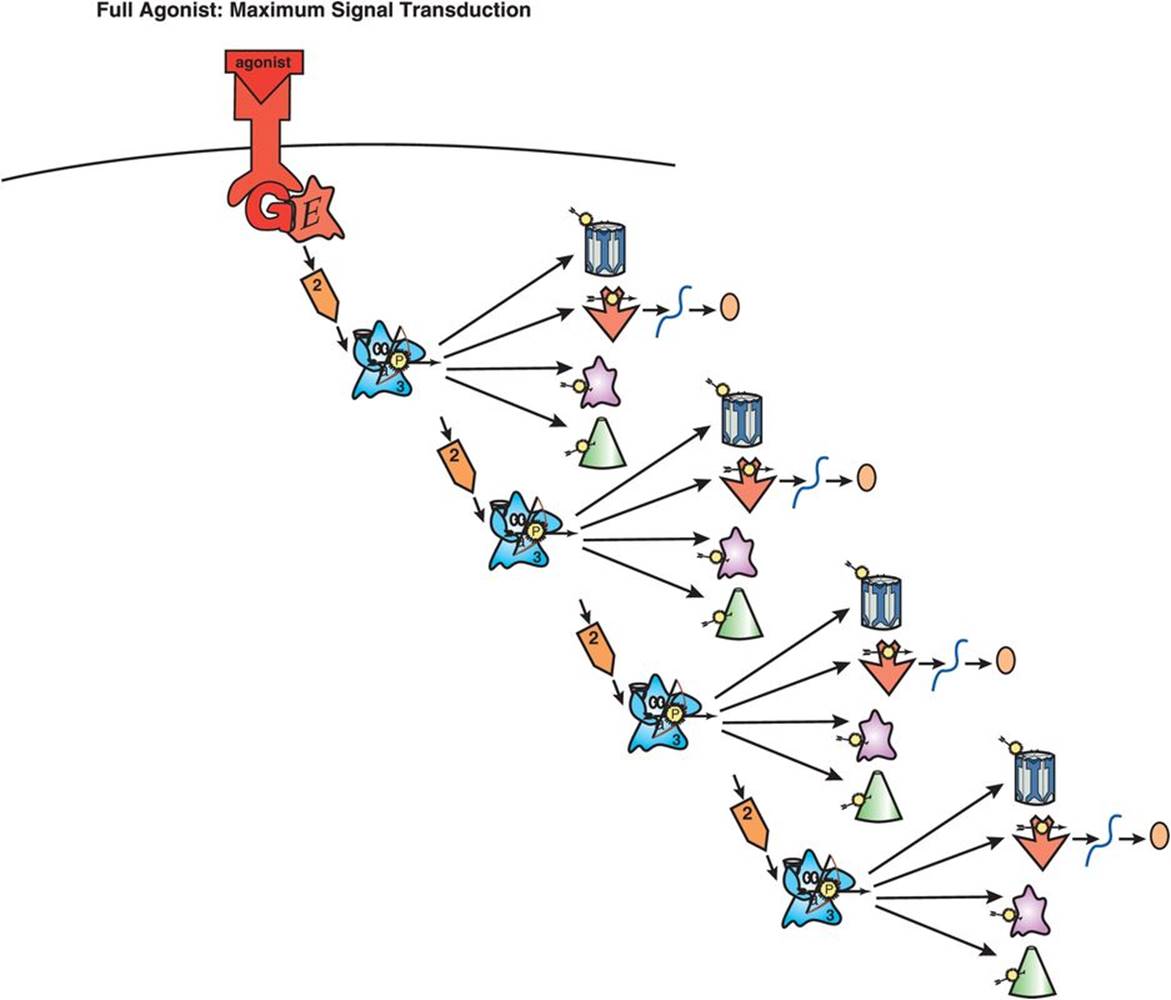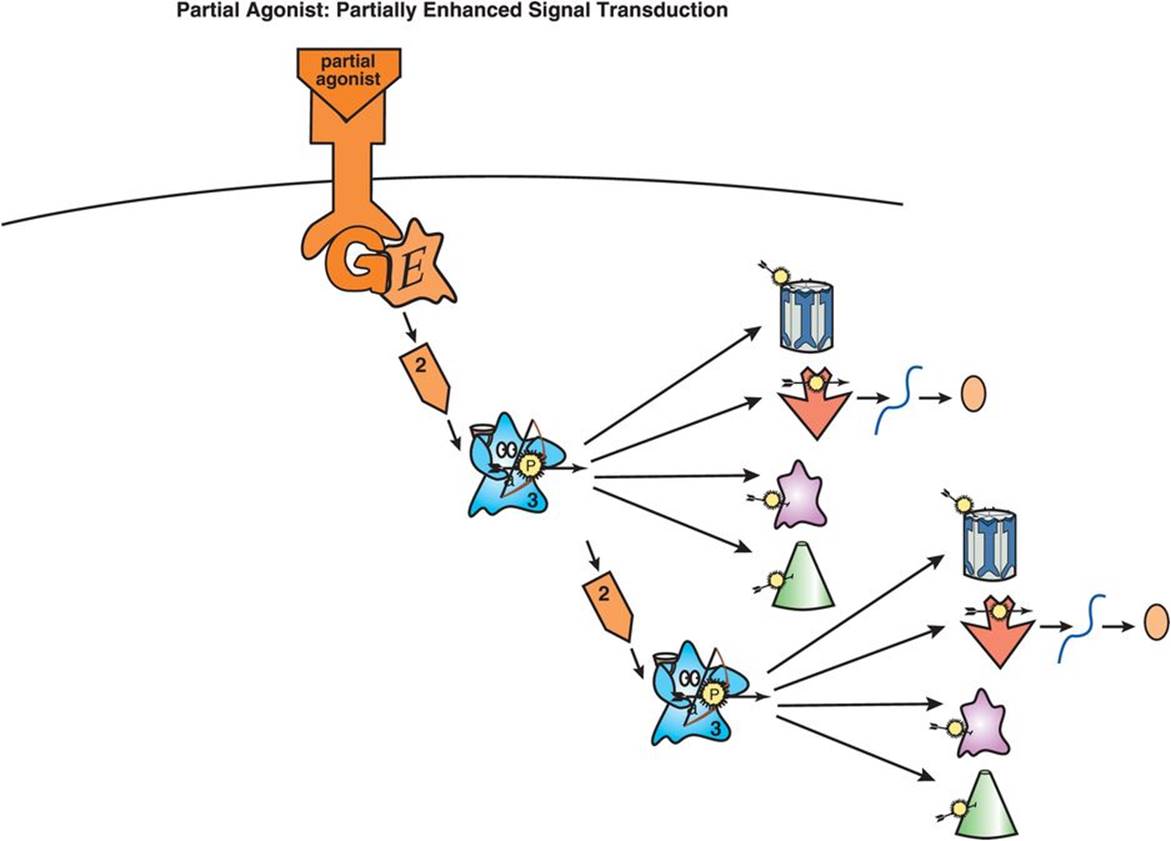 Figure 2-7. Partial agonist. Partial agonists stimulate G-protein-linked receptors to enhance signal transduction but do not lead to maximum signal transduction the way full agonists do. Thus, in the absence of a full agonist, partial agonists increase signal transduction. However, in the presence of a full agonist, the partial agonist will actually turn down the strength of various downstream signals. For this reason, partial agonists are sometimes referred to as stabilizers.