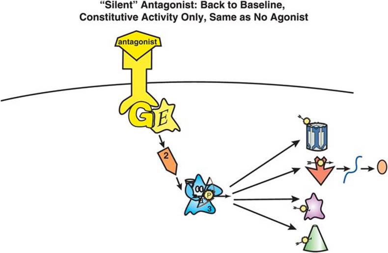 By themselves, therefore, it is easy to see that true antagonists have no activity, and why they are sometimes referred to as “silent.” Silent antagonists return the entire spectrum of drug-induced conformational changes in the G-protein-linked receptor (Figures 2-3 and 2-10) to the same place (Figure 2-6) – i.e., the conformation that exists in the absence of agonist (Figure 2-4).
