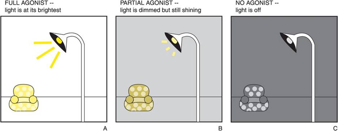 Figure 2-8. Agonist spectrum: rheostat. A useful analogy for the agonist spectrum is a light controlled by a rheostat. The light will be brightest after a full agonist turns the light switch fully on (A). A partial agonist will also act as a net agonist and turn the light on, but only partially, according to the level preset in the partial agonist’s rheostat (B). If the light is already on, a partial agonist will “dim” the lights, thus acting as a net antagonist. When no full or partial agonist is present, the situation is analogous to the light being switched off (C).