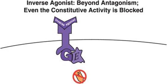 Inverse agonists are more than simple antagonists, and are neither neutral nor silent. These agents have an action that is thought to produce a conformational change in the G-protein-linked receptor that stabilizes it in a totally inactive form (Figure 2-9). Thus, this conformation produces a functional reduction in signal transduction (Figure 2-9) that is even less than that produced when there is either no agonist present (Figure 2-4) or a silent antagonist present (Figure 2-6). The result of an inverse agonist is to shut down even the constitutive activity of the G-protein-linked receptor system. Of course, if a given receptor system has no constitutive activity, perhaps in cases when receptors are present in low density, then there will be no reduction in activity and the inverse agonist will look like an antagonist.