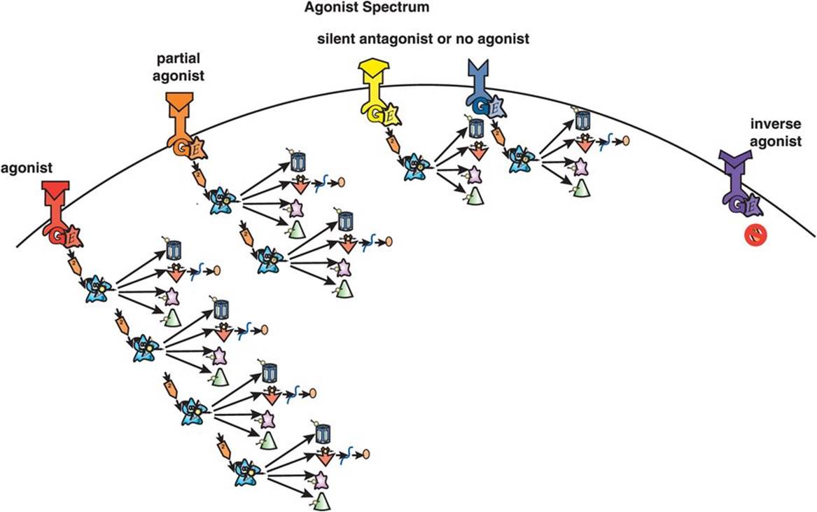 In summary, G-protein-linked receptors act along an agonist spectrum, and drugs have been described that can produce conformational changes in these receptors to create any state from full agonist, to partial agonist, to silent antagonist, to inverse agonist (Figure 2-10). When one considers signal transduction along this spectrum (Figure 2-10), it is easy to understand why agents at each point along the agonist spectrum differ so much from each other, and why their clinical actions are so different.
