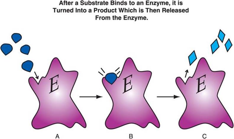 Figure 2-11. Enzyme activity. Enzyme activity is the conversion of one molecule into another. Thus, a substrate is said to be turned into a product by enzymatic modification of the substrate molecule. The enzyme has an active site at which the substrate can bind specifically (A). The substrate then finds the active site of the enzyme and binds to it (B), so that a molecular transformation can occur, changing the substrate into the product (C).
