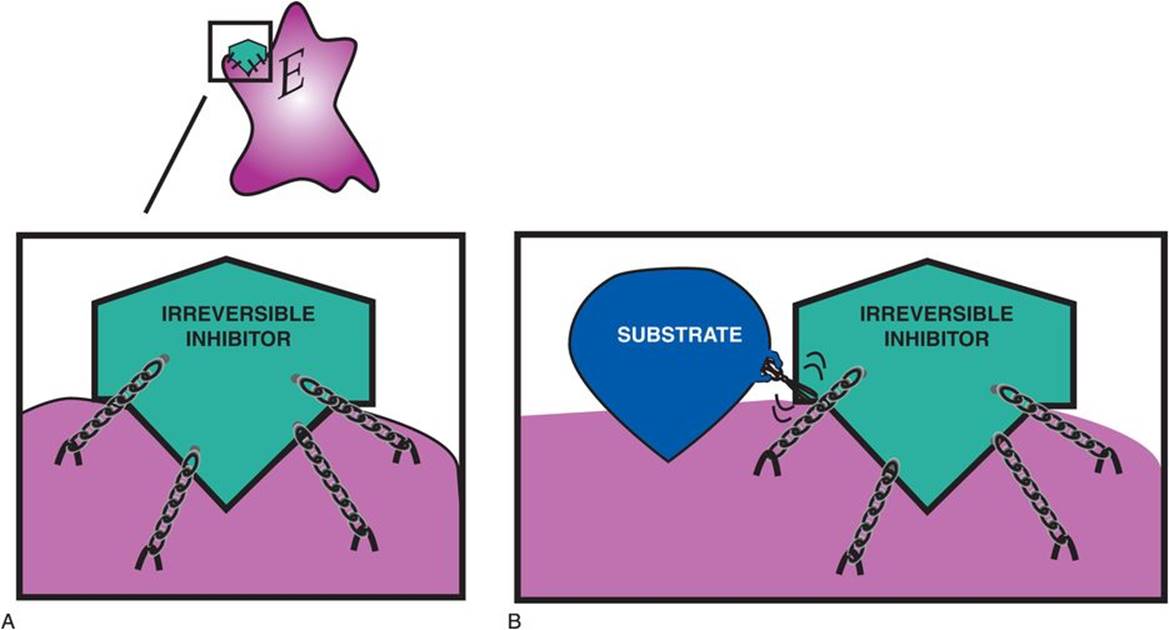 When an irreversible inhibitor binds to the enzyme, it cannot be displaced by the substrate; thus, that inhibitor binds irreversibly (Figure 2-12). This is depicted as binding with chains (Figure 2-12A) that cannot be cut with scissors by the substrate (Figure 2-12B). The irreversible type of enzyme inhibitor is sometimes called a “suicide inhibitor” because it covalently and irreversibly binds to the enzyme protein, permanently inhibiting it and therefore essentially “killing” it by making the enzyme nonfunctional forever (Figure 2-12). Enzyme activity in this case is only restored when new enzyme molecules are synthesized.