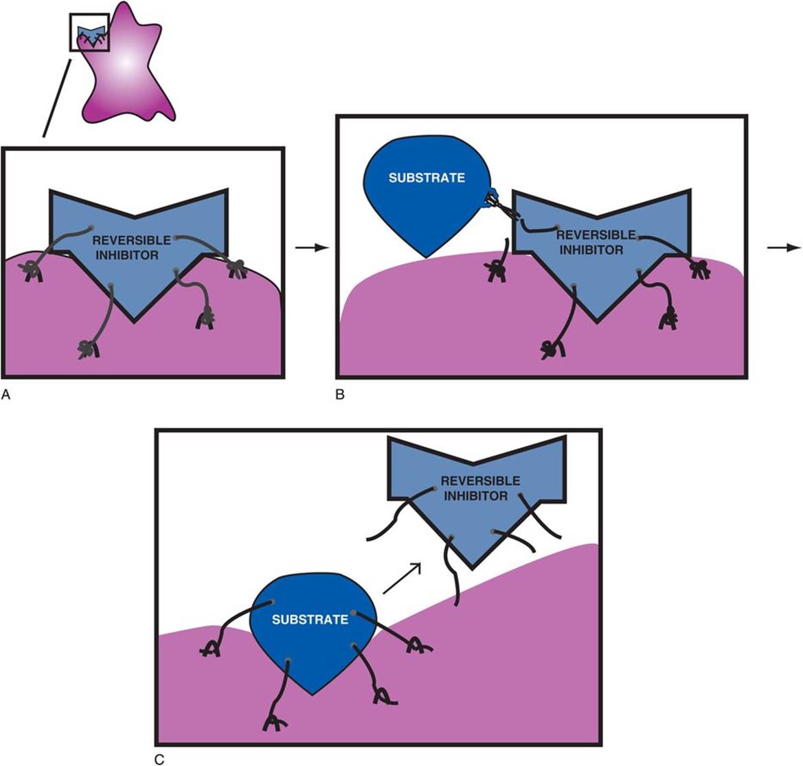 Figure 2-13. Reversible enzyme inhibitors. Other drugs are reversible enzyme inhibitors, depicted as binding to the enzyme with a string (A). A reversible inhibitor can be challenged by a competing substrate for the same enzyme. In the case of a reversible inhibitor, the molecular properties of the substrate are such that it can get rid of the reversible inhibitor, depicted as scissors cutting the string that binds the reversible inhibitor to the enzyme (B). The consequence of a substrate competing successfully for reversal of enzyme inhibition is that the substrate displaces the inhibitor and shoves it off (C). Because the substrate has this capability, the inhibition is said to be reversible.