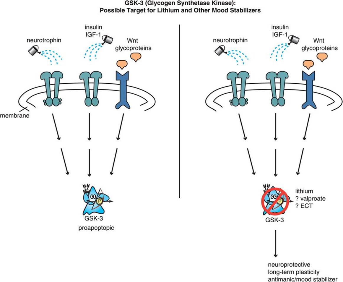 Figure 2-14. Receptor tyrosine kinases. Receptor tyrosine kinases are potential targets for novel psychotropic drugs. Left: Some neurotrophins, growth factors, and other signaling pathways act through a downstream phosphoprotein, an enzyme called GSK-3 (glycogen synthase kinase), to promote cell death (proapoptotic actions). Right: Lithium and possibly some other mood stabilizers may inhibit this enzyme, which could lead to neuroprotective actions and long-term plasticity as well as possibly contribute to mood-stabilizing actions.