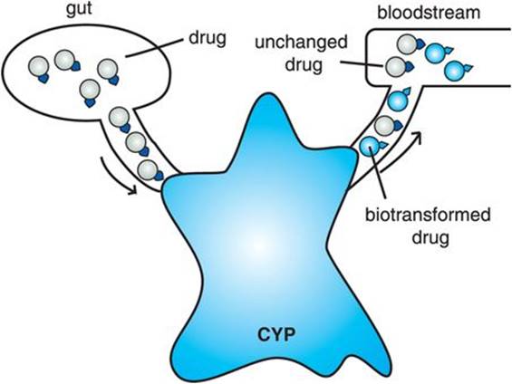 CYP enzymes follow the same principles of enzymes transforming substrates into products as illustrated in Figures 2-11 through 2-13. Figure 2-15 depicts the concept of a psychotropic drug being absorbed through the gut wall on the left and then sent to the big blue enzyme in the liver to be biotransformed so that the drug can be sent back into the bloodstream to be excreted from the body via the kidney. Specifically, CYP enzymes in the gut wall or liver convert the drug substrate into a biotransformed product in the bloodstream. After passing through the gut wall and liver, the drug will exist partially as unchanged drug and partially as biotransformed product in the bloodstream (Figure 2-15).
