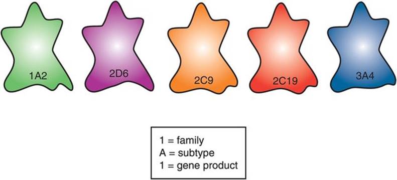 Figure 2-16. Five CYP enzymes. There are many cytochrome P450 (CYP) systems; these are classified according to family, subtype, and gene product. Five of the most important are shown here: CYP 1A2, 2D6, 2C9, 2C19, and 3A4.