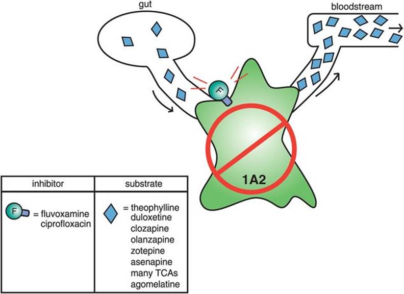 Figure 2-17. Consequences of CYP 1A2 inhibition. Numerous drugs (theophylline, duloxetine, clozapine, olanzapine, zotepine, asenapine, certain tricyclic antidepressants (TCAs), and agomelatine) are substrates for CYP 1A2. Thus, in the presence of a CYP 1A2 inhibitor (fluvoxamine, ciprofloxacin) their levels will rise. In many cases, this means that the dose of the substrate must often be lowered in order to avoid side effects.