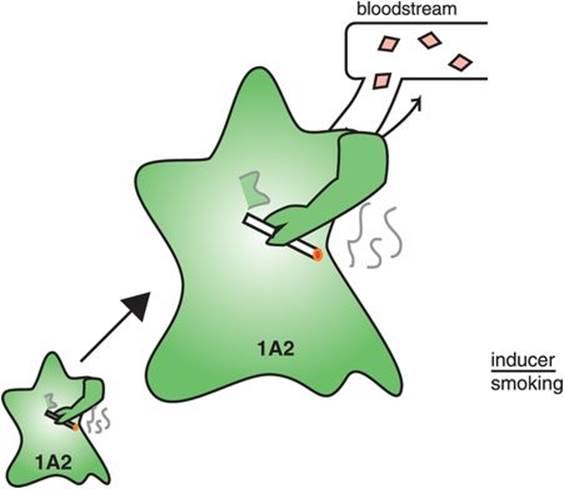 1A2 can also be induced, or increased in activity, by smoking. When patients smoke, any substrate of 1A2 may have its blood and brain levels fall and require more dosage. Also, patients stabilized on an antipsychotic dose who start smoking may relapse if the drug levels fall too low. Cigarette smokers may require higher doses of 1A2 substrates than nonsmokers (Figure 2-18).