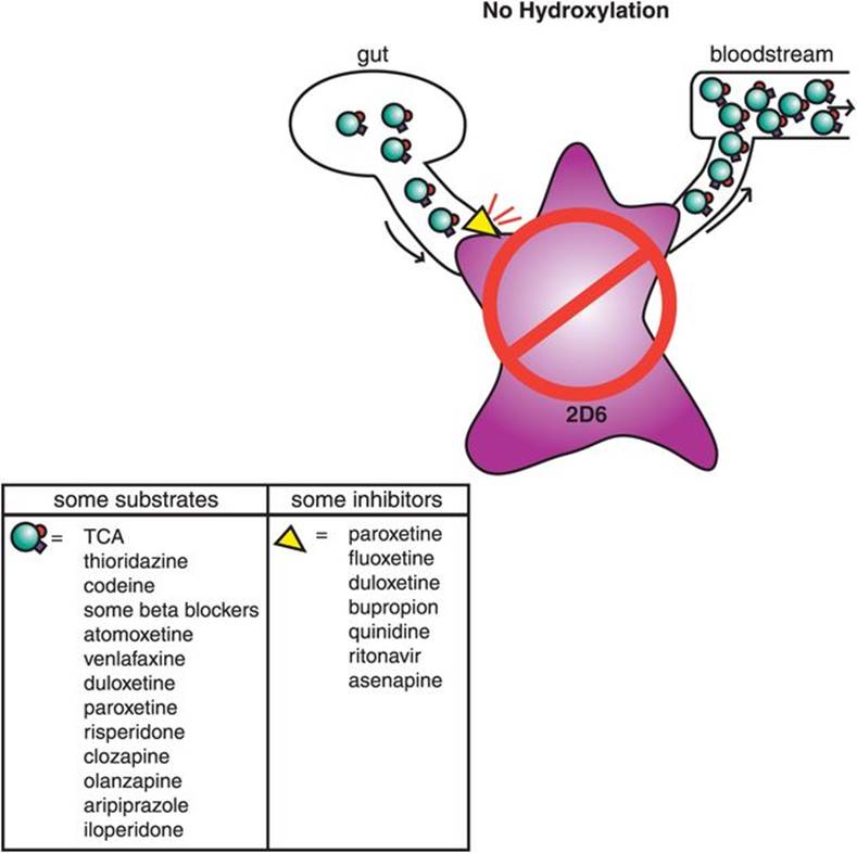 Figure 2-19. Consequences of CYP 2D6 inhibition. If a tricyclic antidepressant (a substrate for CYP 2D6) is given concomitantly with an agent that is an inhibitor of CYP 2D6 (e.g., paroxetine, fluoxetine), this will cause the levels of the tricyclic antidepressant to increase, which can be toxic. Therefore either monitoring of tricyclic plasma concentration with dose reduction or avoidance of this combination is required. Many other psychotropic medications are also substrates for CYP 2D6 and may therefore have increased blood levels when given with a CYP 2D6 inhibitor.
