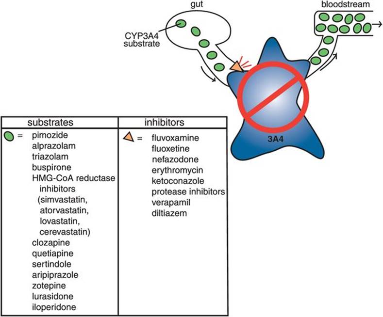 Figure 2-20. Substrates and inhibitors for CYP 3A4. The antipsychotic pimozide, the benzodiazepines alprazolam and triazolam, the anxiolytic buspirone, HMG-CoA reductase inhibitors (statins), and multiple antipsychotics are all substrates for CYP 3A4. Fluvoxamine, fluoxetine, and nefazodone are moderate CYP 3A4 inhibitors, as are some nonpsychotropic agents.