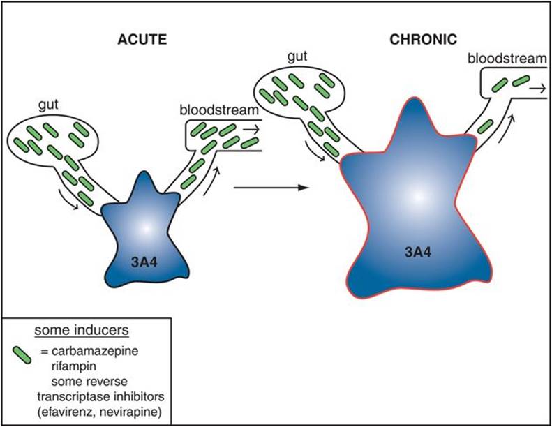 Figure 2-21. CYP 3A4 induced by carbamazepine. The enzyme CYP 3A4 can be induced by the anticonvulsant and mood stabilizer carbamazepine, as well as by rifampin and some reverse transcriptase inhibitors. This would lead to increased metabolism of substrates for 3A4 (e.g., clozapine, quetiapine, ziprasidone, sertindole, aripiprazole, and zotepine) and may therefore require higher doses of these agents when given concomitantly with carbamazepine.