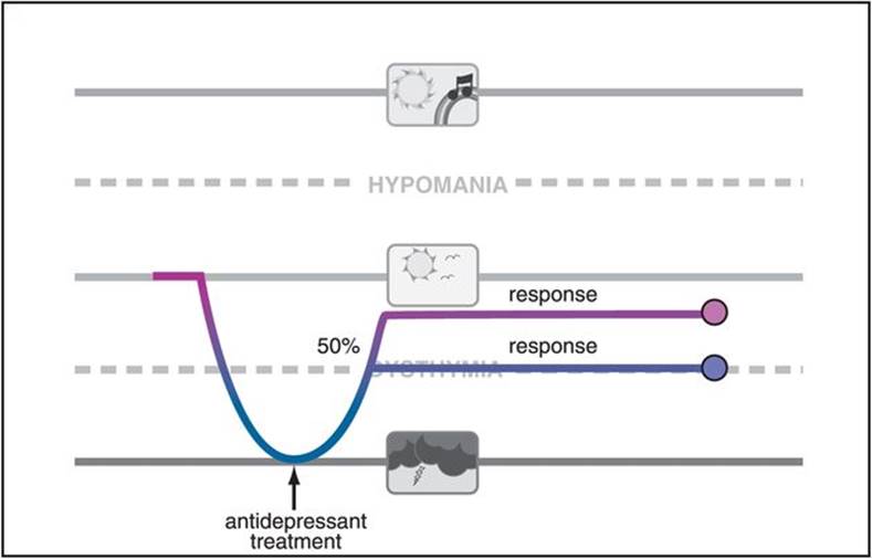 Figure 7-1. Response. When treatment of depression results in at least 50% improvement in symptoms, it is called a response. Such patients are better but not well. Previously, this was considered the goal of depression treatment.
