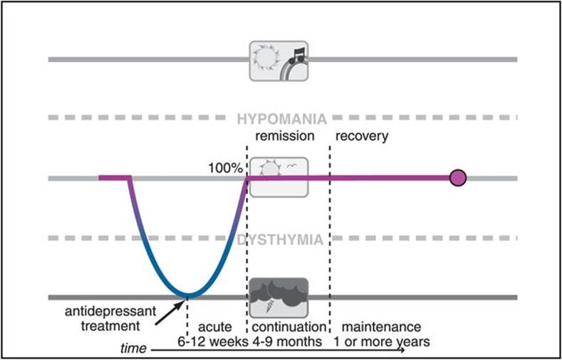 Figure 7-2. Remission. When treatment of depression results in removal of essentially all symptoms, it is called remission for the first several months and then recovery if it is sustained for longer than 6 months. Such patients are not just better – they are well. However, they are not cured, since depression can still recur. Remission and recovery are now the goals when treating patients with depression.