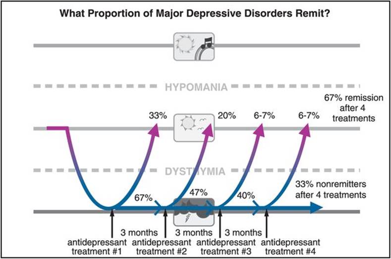 “Real world” trials of antidepressants tested in clinical practice settings that include patients normally excluded from marketing trials, such as the STAR*D trial of antidepressants (Sequenced Treatment Alternatives to Relieve Depression), have recently provided sobering results. Only a third of such patients remit on their first antidepressant treatment, and even after a year of treatment with a sequence of four different antidepressants given for 12 weeks each, only about two-thirds of depressed patients achieve remission of their symptoms (Figure 7-4).