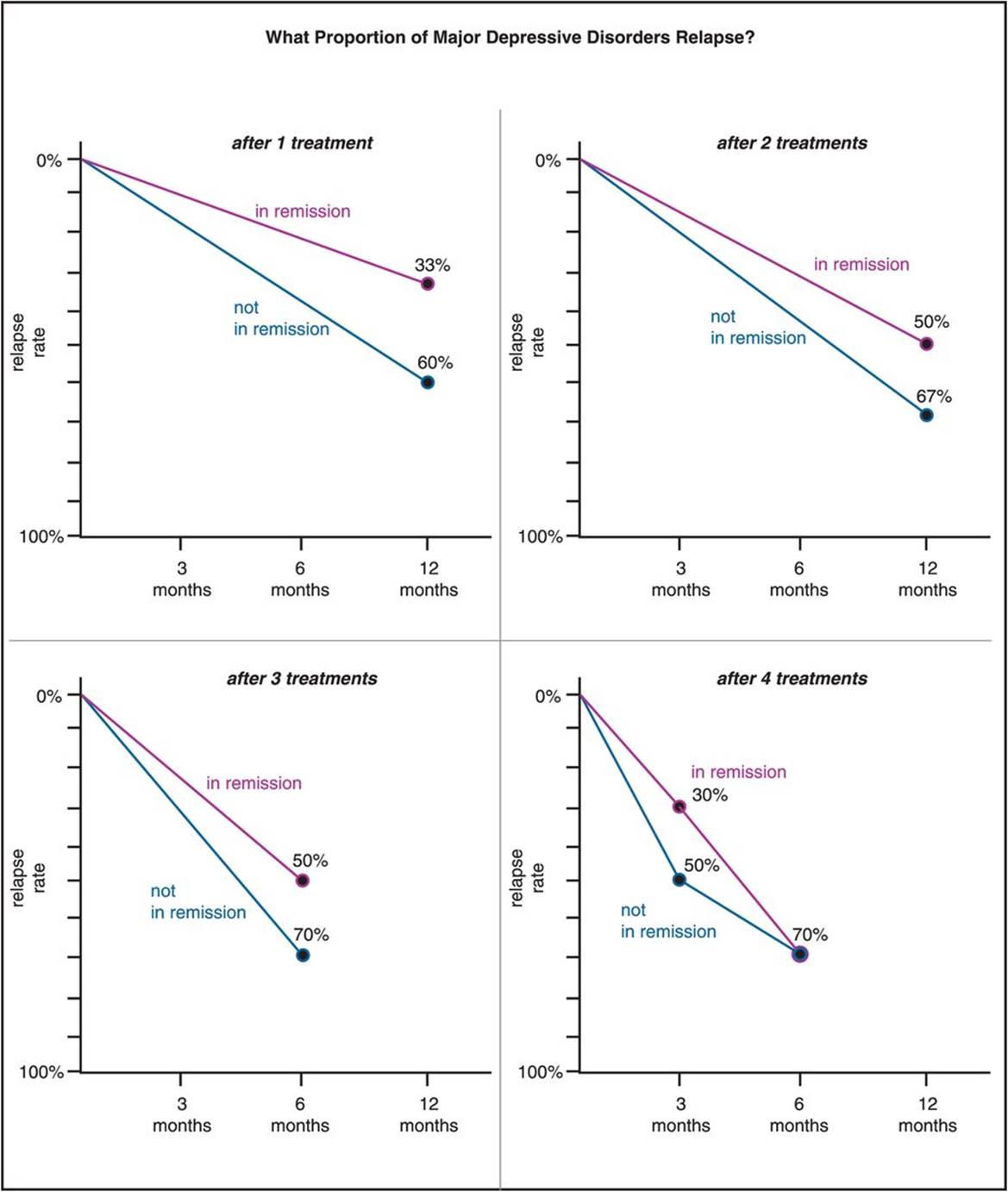 Figure 7-6. Relapse rates. The rate of relapse of major depression is significantly less for patients who achieve remission. However, there is still risk of relapse even in remitters, and the likelihood increases with the number of treatments it takes to get the patient to remit. Thus the relapse rate for patients who do not remit ranges from 60% at 12 months after one treatment to 70% at 6 months after four treatments; but for those who do remit, it ranges from only 33% at 12 months after one treatment all the way to 70% at 6 months after four treatments. In other words, the protective nature of remission virtually disappears once it takes four treatments to achieve remission.