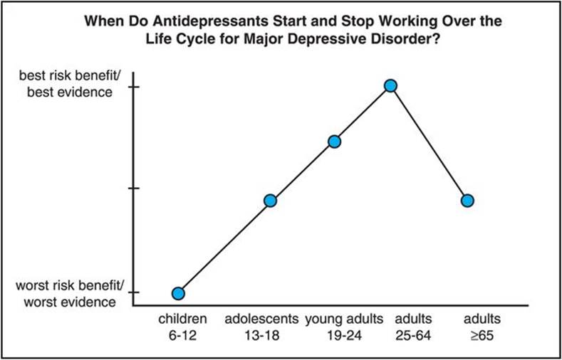 Figure 7-7. Antidepressants over the life cycle. The efficacy, tolerability, and safety of antidepressants have been studied mostly in individuals between the ages of 25 and 64. Existing data across all age groups suggest that the risk–benefit ratio is most favorable for adults between the ages of 25 and 64 and somewhat less so for adults between the ages of 19 and 24, due to a possibly increased risk of suicidality in younger adults. Limited data in children and adolescents also suggest increased risk of suicidality; this, coupled with a lack of data demonstrating clear antidepressant efficacy, gives children between the ages of 6 and 12 the worst risk–benefit ratio, with adolescents intermediate between young adults and children. Elderly patients, 65 years of age and older, may not respond as well or as quickly to antidepressants as other adults and may also experience more side effects than younger adults.