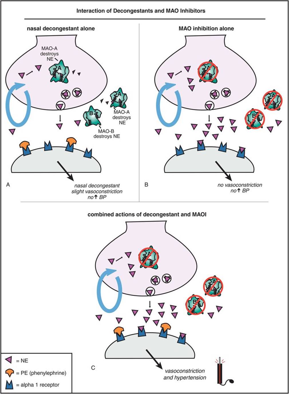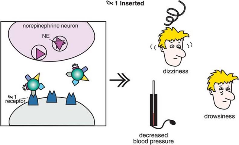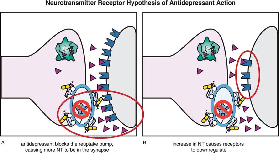 Figure 7-9. Neurotransmitter receptor hypothesis of antidepressant action. Although antidepressants cause an immediate increase in monoamines, they do not have immediate therapeutic effects. This may be explained by the monoamine receptor hypothesis of depression, which states that depression is caused by upregulation of monoamine receptors; thus antidepressant efficacy would be related to downregulation of those receptors, as shown here. (A) When an antidepressant blocks a monoamine reuptake pump, this causes more neurotransmitter (NT) (in this case, norepinephrine) to accumulate in the synapse. (B) The increased availability of NT ultimately causes receptors to downregulate. The time course of receptor adaptation is consistent both with the delayed clinical effects of antidepressants and with development of tolerance to antidepressant side effects.