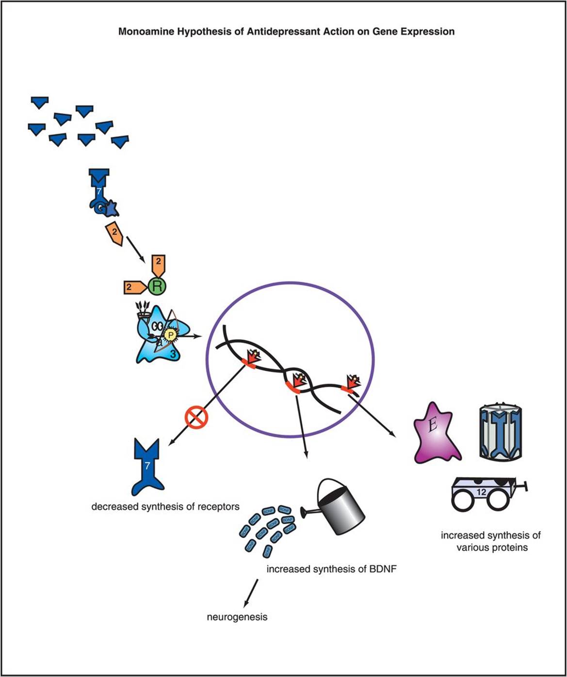 Figure 7-10. Monoamine hypothesis of antidepressant action on gene expression. Adaptations in receptor number or sensitivity are likely due to alterations in gene expression, as shown here. The neurotransmitter at the top is presumably increased by an antidepressant. The cascading consequence of this is ultimately to change the expression of critical genes in order to effect an antidepressant response. This includes downregulating some genes so that there is decreased synthesis of receptors as well as upregulating other genes so that there is increased synthesis of critical proteins, such as brain-derived neurotrophic factor (BDNF).