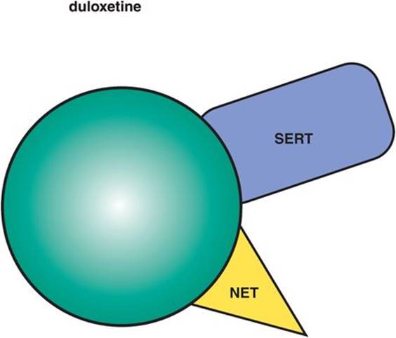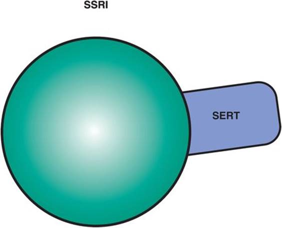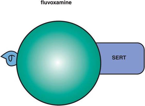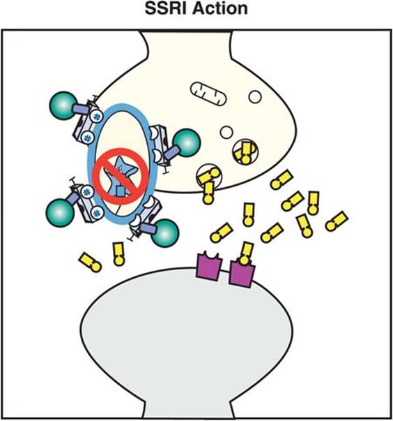 Figure 7-11. Selective serotonin reuptake inhibitors. Shown here is an icon depicting the core feature of selective serotonin reuptake inhibitors (SSRIs), namely serotonin reuptake inhibition. Although the agents in this class have unique pharmacological profiles, they all share the common property of serotonin transporter (SERT) inhibition.