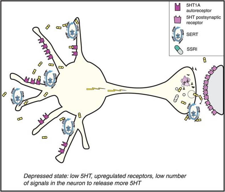Figure 7-13. Mechanism of action of selective serotonin reuptake inhibitors (SSRIs), part 1. Depicted here is a serotonin (5HT) neuron in a depressed patient. In depression, the 5HT neuron is conceptualized as having a relative deficiency of the neurotransmitter 5HT. Also, the number of 5HT receptors is upregulated, including presynaptic 5HT1A autoreceptors as well as postsynaptic 5HT receptors.