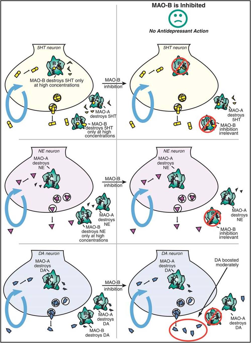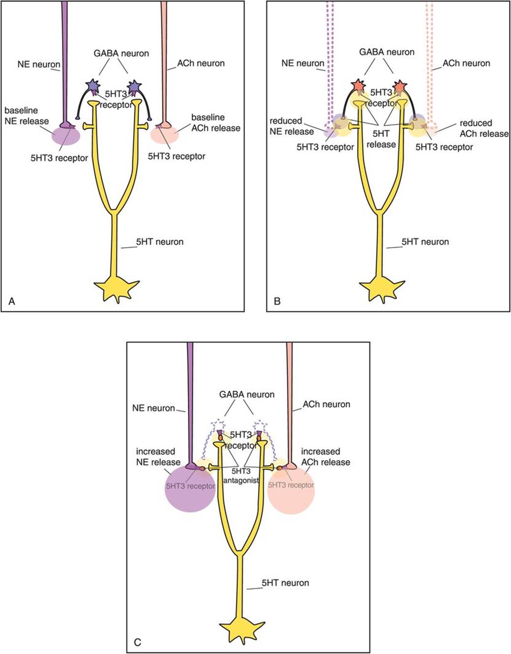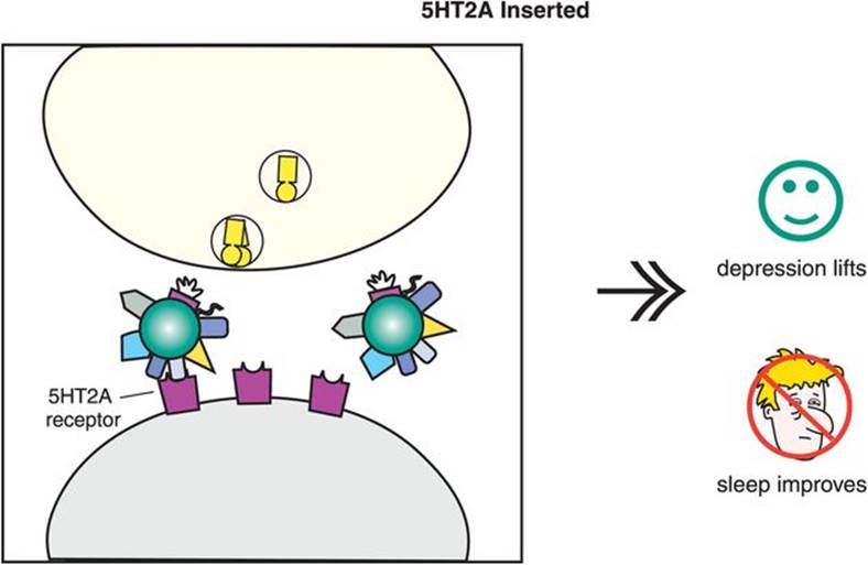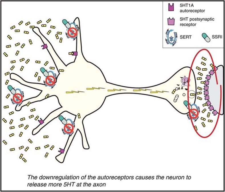 Over time, the increased 5HT acting at the somatodendritic 5HT1A autoreceptors causes them to downregulate and become desensitized (on the left in Figure 7-15). This desensitization occurs because the increase in serotonin is recognized by these presynaptic 5HT1A receptors, and this information is sent to the cell nucleus of the serotonin neuron. The genome’s reaction to this information is to issue instructions that cause these same receptors to become desensitized over time. The time course of this desensitization correlates with the onset of therapeutic actions of the SSRIs.