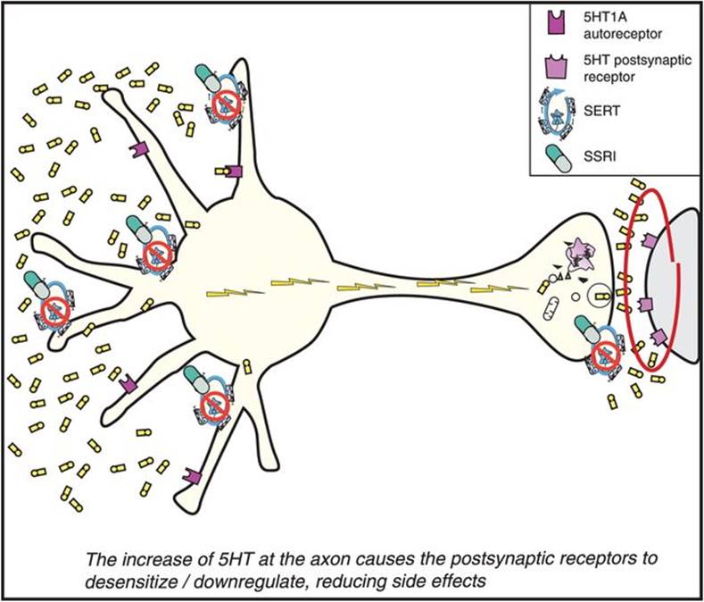 This theory thus suggests a pharmacological cascading mechanism whereby the SSRIs exert their therapeutic actions: namely, powerful but delayed disinhibition of serotonin release in key pathways throughout the brain. Furthermore, side effects are hypothetically caused by the acute actions of serotonin at undesirable receptors in undesirable pathways. Finally, side effects may attenuate over time by desensitization of the very receptors that mediate them.