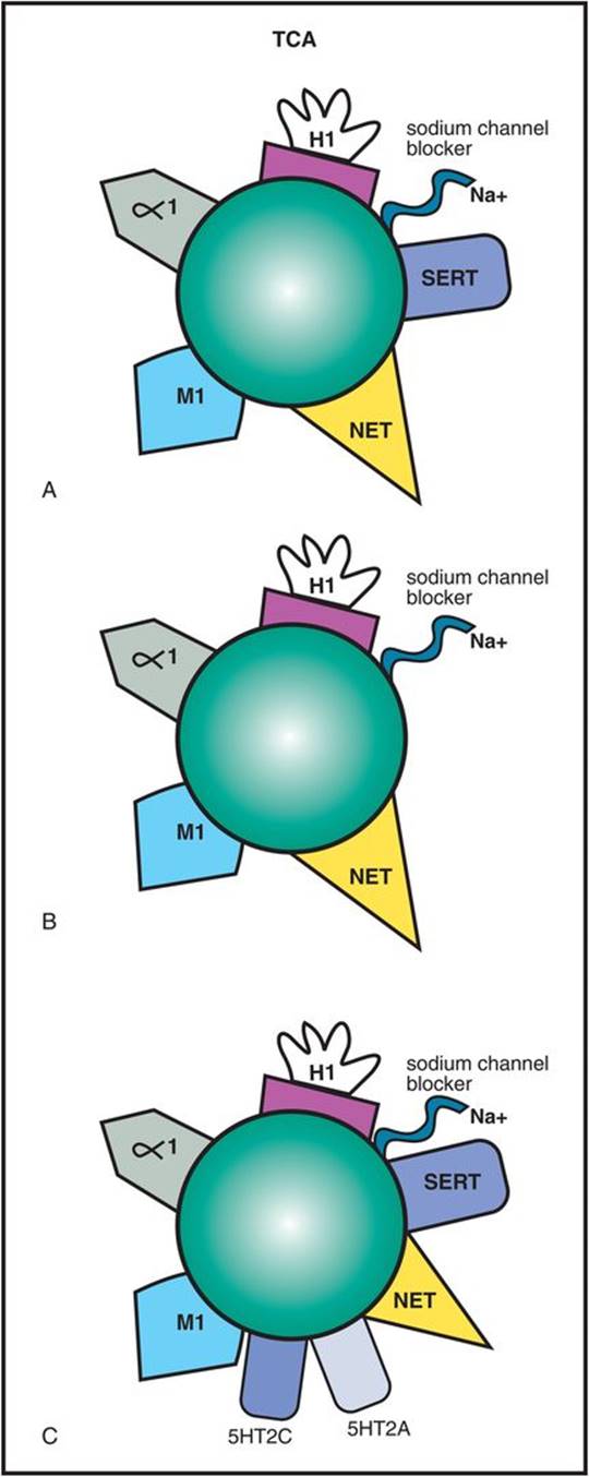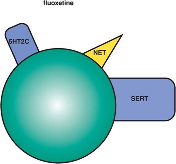 This SSRI also has 5HT2C antagonist actions that may explain many of its unique clinical properties (Figure 7-18). 5HT2C antagonism is explained in Chapter 5 and illustrated in Figures 5-52A and 5-52B. Other antidepressants with 5HT2C antagonist properties include mirtazapine and agomelatine; several atypical antipsychotics including quetiapine with proven antidepressant properties, as well as olanzapine, asenapine, and clozapine, also have potent 5HT2Cantagonist actions. Blocking serotonin action at 5HT2C receptors disinhibits (i.e., enhances) release of both NE and DA (Figure 5-52B). 5HT2C antagonism may contribute not only to fluoxetine’s therapeutic actions but also to its tolerability profile.