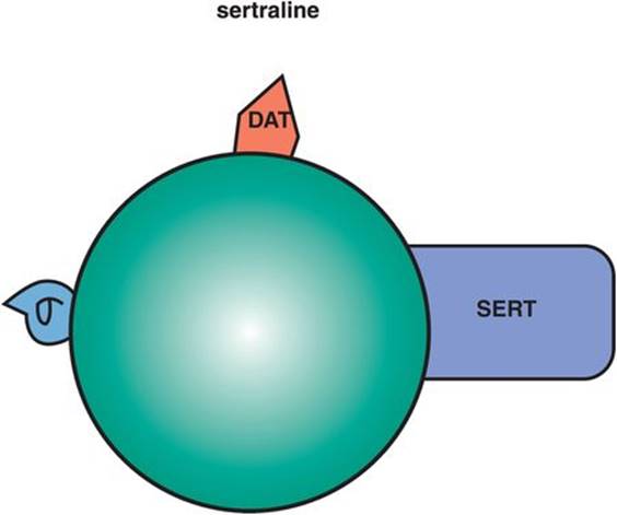 Figure 7-19. Sertraline. Sertraline has dopamine reuptake inhibition (DRI) and σ1 receptor binding in addition to serotonin reuptake inhibition (SRI). The clinical relevance of sertraline’s DRI is unknown, although it may improve energy, motivation, and concentration. Its σ properties may contribute to anxiolytic actions and may also be helpful in patients with psychotic depression.