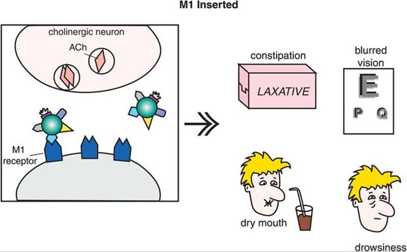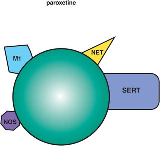 This SSRI is preferred by many clinicians for patients with anxiety symptoms. It tends to be more calming, even sedating, early in treatment compared to the more activating actions of both fluoxetine and sertraline discussed above. Perhaps the mild anticholinergic actions of paroxetine contribute to this clinical profile (Figure 7-20). Paroxetine also has weak NET (norepinephrine transporter) inhibitory properties, which could contribute to its efficacy in depression, especially at high doses. The advantages of dual serotonin plus norepinephrine reuptake inhibiting properties, or SNRI actions, are discussed below in the section on SNRIs. It is possible that weak to moderate NET inhibition of paroxetine may contribute importantly to its antidepressant actions.