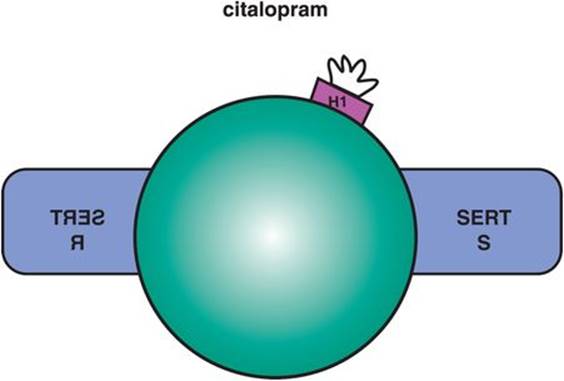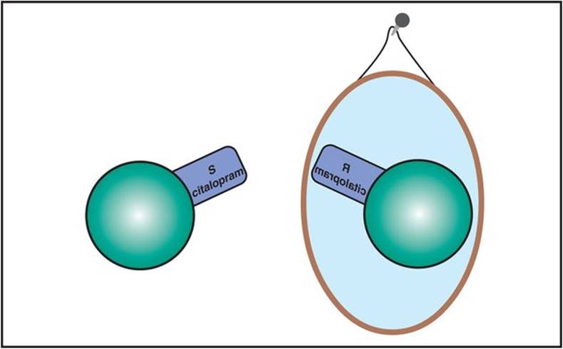 This SSRI is comprised of two enantiomers, R and S, one of which is the mirror image of the other (Figure 7-22). The mixture of these enantiomers is known as racemic citalopram, or commonly just as citalopram, and it has mild antihistaminic properties that reside in the R enantiomer (Figure 7-22). Racemic citalopram is generally one of the better-tolerated SSRIs, and has favorable findings in the treatment of depression in the elderly, but has a somewhat inconsistent therapeutic action at the lowest dose, often requiring dose increase to optimize treatment. However, dose increase is limited due to the potential for QTc prolongation. These findings all suggest that it is not favorable for citalopram to contain the R enantiomer. In fact, some pharmacologic evidence suggests that the R enantiomer may be pharmacologically active at SERT in a manner that does not inhibit SERT but actually interferes with the ability of the active S enantiomer to inhibit SERT. This could lead to reduced inhibition of SERT, reduced synaptic 5HT, and possibly reduced net therapeutic actions, especially at low doses.