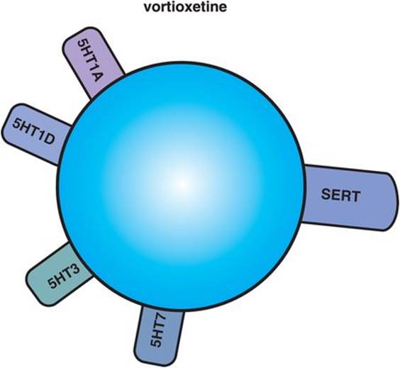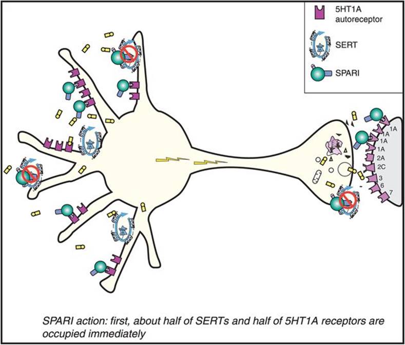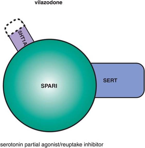 A new antidepressant introduced in the US is vilazodone, which combines SERT inhibition with a second property: 5HT1A partial agonism. For this reason, vilazodone is called a SPARI (serotonin partial agonist/reuptake inhibitor) (Figure 7-24). The combination of serotonin reuptake inhibition with 5HT1A partial agonism has long been known by clinicians to enhance the antidepressant properties and tolerability of SSRIs/SNRIs in some patients. Although vilazodone is the only approved agent selective for just these two actions, SERT inhibition combined with 5HT1A partial agonism has been achieved in the past by adding atypical antipsychotics with 5HT1A partial agonist actions such as quetiapine or aripiprazole to SSRIs/SNRIs (discussed in Chapter 5: see Figures 5-47 and 5-62). Vilazodone administration, however, is not completely identical to this option since atypical antipsychotics have many additional pharmacologic actions, some desirable and others not (Figures 5-47 and 5-62).