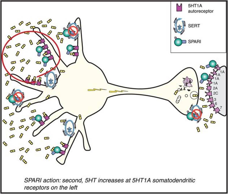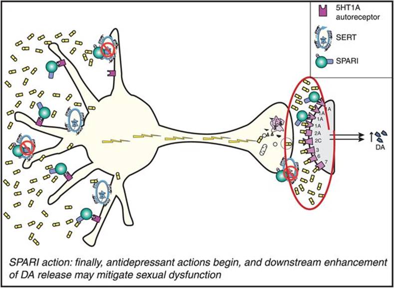 5HT1A partial agonist actions plus SERT inhibition can also be attained by augmenting SSRIs/SNRIs with the 5HT1A partial agonist buspirone. However, this is not identical to the actions of vilazodone since buspirone and its active metabolite 6-hydroxybuspirone are weaker 5HT1A partial agonists than vilazodone and are estimated to occupy fewer 5HT1A receptors for a shorter time at clinically administered doses than does vilazodone. Buspirone and 6-hydroxybuspirone also bind to 5HT1A receptors with lower affinity than 5HT itself, whereas vilazodone binds to 5HT1A receptors with higher affinity than 5HT. This suggests that administration of buspirone as an augmenting agent to an SSRI/SNRI likely results in 5HT1A receptor occupancy that occurs more robustly in states of low 5HT levels and not as robustly in states of high 5HT levels, whereas administration of vilazodone results in binding to 5HT1Areceptors even in the presence of 5HT. Another difference between buspirone plus an SSRI/SNRI versus vilazodone is that when buspirone augments an SSRI, the buspirone is generally dosed so that about 10–20% of 5HT1Areceptors are occupied and the SSRI is dosed so that about 80% of SERTs are blocked. On the other hand, human neuroimaging studies suggest that vilazodone is dosed so that about 50% of both SERTs and 5HT1A receptors are occupied. Whether this accounts for clinically significant differences between the administration of vilazodone monotherapy and the augmentation of SSRIs/SNRIs with buspirone is not known, but it could account for the apparent lesser incidence of sexual dysfunction with vilazodone than with either SSRIs alone or with the augmentation of SSRIs with buspirone. It is not known whether the enhanced efficacy of buspirone combined with SSRIs for depression demonstrated in clinical trials for patients who fail SSRI monotherapy also applies to vilazodone, as appropriate clinical trials to determine this have not yet been conducted. In animal models, adding 5HT1A partial agonism to SSRIs causes more immediate and robust elevations of brain 5HT levels than SSRIs do alone. This is thought to be due to the fact that 5HT1A partial agonists are a type of “artificial serotonin” selective especially for presynaptic somatodendritic 5HT1A autoreceptors, and that 5HT1A partial agonist action occurs immediately after drug is given (Figure 7-25). Thus, 5HT1A immediate partial agonist actions are theoretically additive or synergistic with simultaneous SERT inhibition, since this leads to faster and more robust actions at 5HT1A somatodendritic autoreceptors (Figure 7-26) than with SERT inhibition alone (Figure 7-14), including their downregulation (Figure 7-27). This hypothetically causes faster and more robust elevation of synaptic 5HT (Figure 7-28) than is possible with SSRIs alone (Figure 7-16). In addition, 5HT1A partial agonism with vilazodone’s SPARI mechanism occurs immediately at postsynaptic 5HT1A receptors (Figure 7-26), with actions at these receptors that are thus faster and with a different type of stimulation compared to the delayed full agonist actions of serotonin itself when increased by SERT inhibition alone (Figure 7-16). The downstream actions of 5HT1A receptors that lead to enhanced dopamine release (Figure 7-29), discussed in Chapter 5 and illustrated in Figures 5-15C and 5-16C, may be hypothetically responsible for the observed reduction in sexual dysfunction seen in patients with the combination of SERT inhibition plus 5HT1A partial agonist actions compared to SERT inhibition alone.