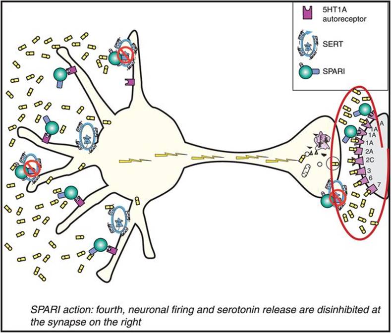 Once the 5HT1A somatodendritic autoreceptors are desensitized, 5HT can no longer effectively turn off its own release. Since 5HT is no longer inhibiting its own release, the serotonin neuron is therefore disinhibited (Figure 7-16). This results in a flurry of 5HT release from axons and an increase in neuronal impulse flow (shown as lightning in Figure 7-16 and release of serotonin from the axon terminal on the right). This is just another way of saying the serotonin release is “turned on” at the axon terminals. The serotonin that now pours out of the various projections of serotonin pathways in the brain is what theoretically mediates the various therapeutic actions of the SSRIs.