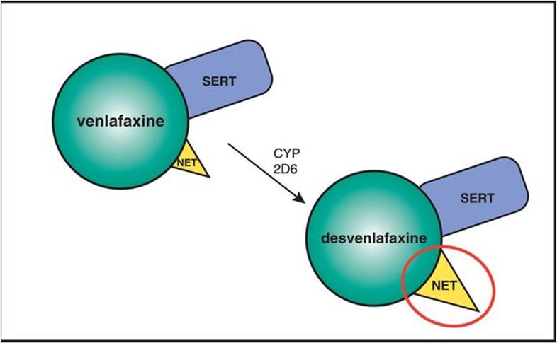 The solution to improving the properties of racemic citalopram is to remove the unwanted R enantiomer. The resulting drug is known as escitalopram, as it is composed of only the pure active S enantiomer (Figure 7-23). This maneuver appears to remove the antihistaminic properties, and there are no higher dose restrictions to avoid QTc prolongation. In addition, removal of the potentially interfering R isomer makes the lowest dose of escitalopram more predictably efficacious. Escitalopram is therefore the SSRI for which pure SERT inhibition is most likely to explain almost all of its pharmacologic actions. Escitalopram is considered perhaps the best-tolerated SSRI, with the fewest CYP-mediated drug interactions.