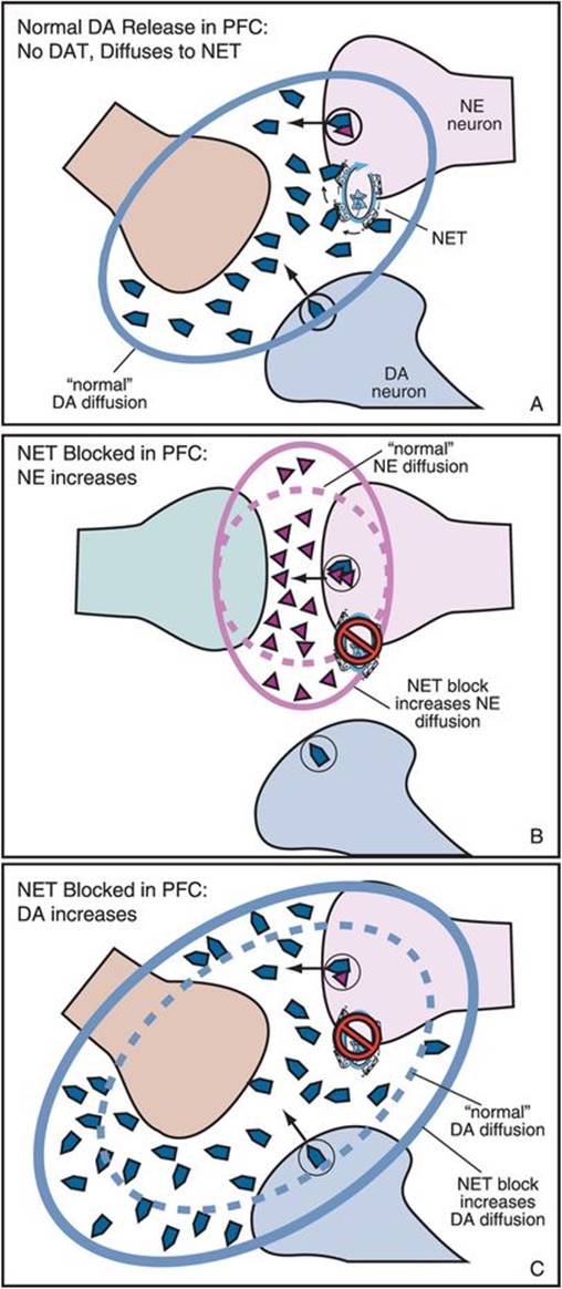 The frequent complaints of residual fatigue, loss of energy, motivation, sex drive, and problems concentrating/problems with alertness may be approached by combining either a stimulant or modafinil with an SNRI to recruit triple monoamine action and especially enhancement of dopamine (Figure 7-88). The stimulant lisdexamfetamine, which links the amino acid lysine to the stimulant d-amphetamine, and which slows the delivery and potentially reduces the abuse liability of d-amphetamine after oral administration, is in late-stage clinical testing as an augmenting agent to SSRIs/SNRIs in treatment-resistant depression.