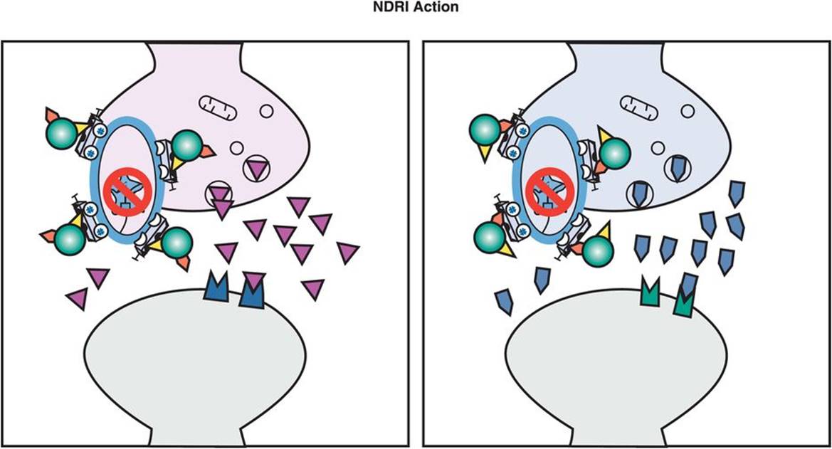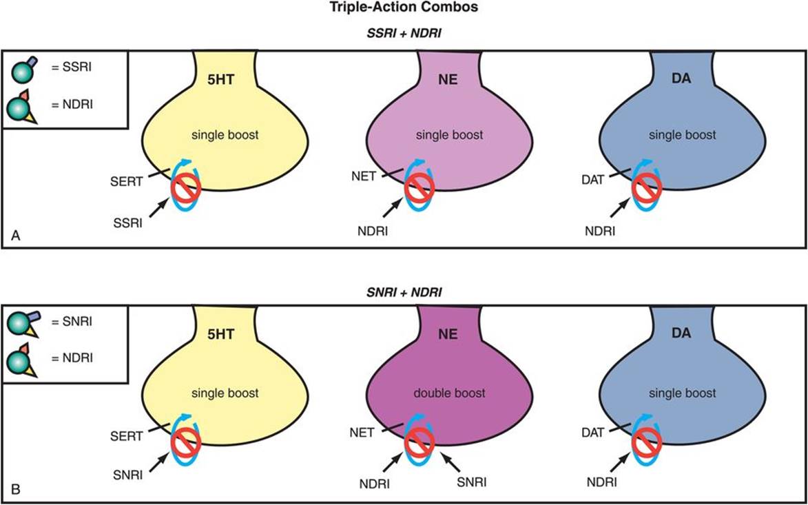 If boosting one neurotransmitter is good, and two is better, maybe three boosted neurotransmitters is best (Figure 7-86). Triple-action antidepressant therapy with modulation of all three monoamines (5HT, DA, and NE) would be predicted to occur by combining either an SSRI with an NDRI, perhaps the most popular combination in US antidepressant psychopharmacology, or by combining an SNRI with an NDRI, providing even more noradrenergic and dopaminergic action.