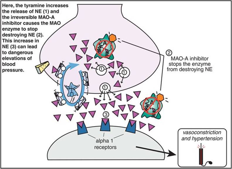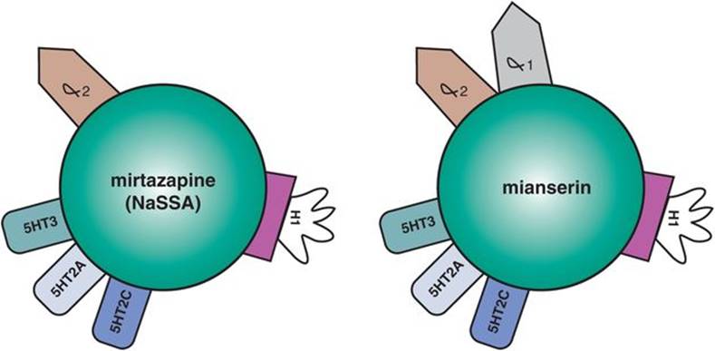 Figure 7-87. Heroic combos, part 2: California rocket fuel. A serotonin–norepinephrine reuptake inhibitor (SNRI) plus mirtazapine is a combination that has a great degree of theoretical synergy: norepinephrine reuptake blockade plus α2 blockade, serotonin (5HT) reuptake plus 5HT2A and 5HT2C antagonism, and thus many 5HT actions plus norepinephrine (NE) actions. Specifically, 5HT is quadruple-boosted (with reuptake blockade, α2antagonism, 5HT2A antagonism, and 5HT2C antagonism), NE is quadruple-boosted (with reuptake blockade, α2 antagonism, 5HT2A antagonism, and 5HT2Cantagonism), and there may even be a double boost of dopamine (with 5HT2A and 5HT2C antagonism).