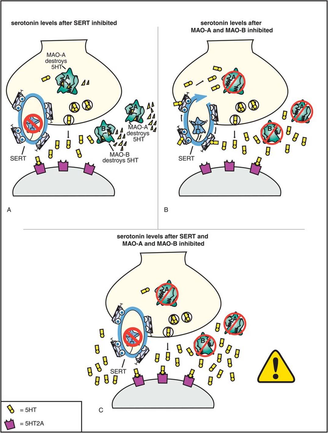 Figure 7-14. Mechanism of action of selective serotonin reuptake inhibitors (SSRIs), part 2. When an SSRI is administered, it immediately blocks the serotonin reuptake pump (see icon of an SSRI drug capsule blocking the reuptake pump, or serotonin transporter [SERT]). However, this causes serotonin to increase initially only in the somatodendritic area of the serotonin neuron (left) and not very much in the axon terminals (right).
