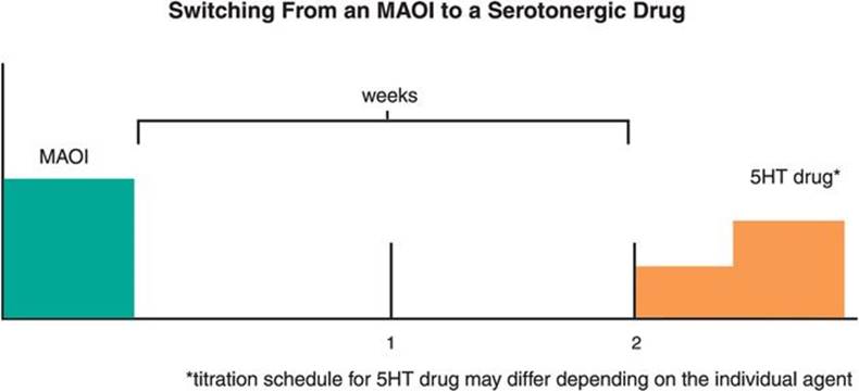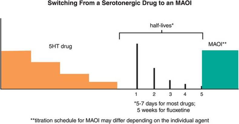 Other unique properties of fluoxetine (Figure 7-18) are weak NE reuptake blocking properties that may become clinically relevant at very high doses. Fluoxetine has a long half-life (2–3 days), and its active metabolite an even longer half-life (2 weeks). The long half-life is advantageous in that it seems to reduce the withdrawal reactions that are characteristic of sudden discontinuation of some SSRIs, but it also means that it takes a long time to clear the drug and its active metabolite after discontinuing fluoxetine, and prior to starting another agent such as a monoamine oxidase inhibitor (MAOI). Fluoxetine is available not only as a once-daily formulation, but also as a once-weekly oral dosage formulation.