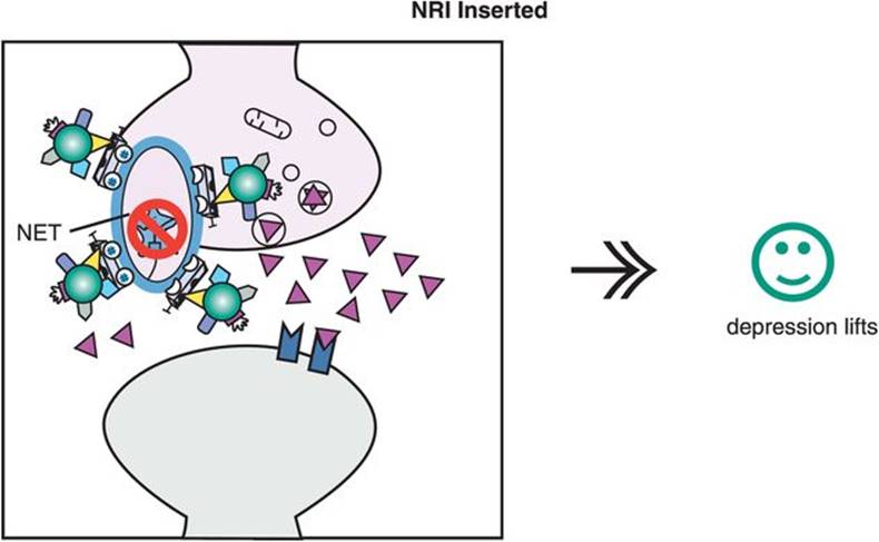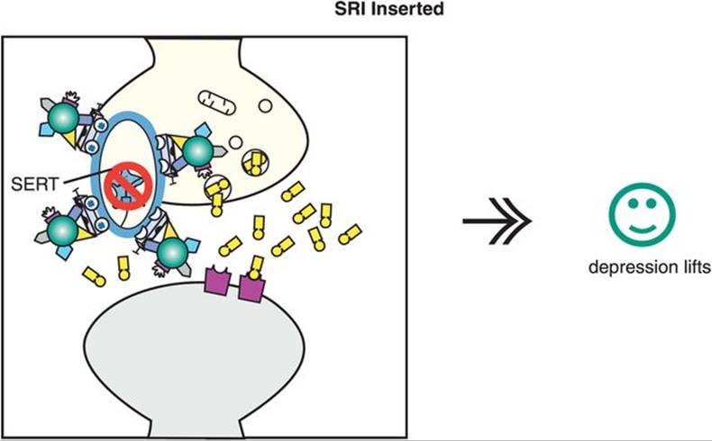 Figure 7-12. SSRI action. In this figure, the serotonin reuptake inhibitor (SRI) portion of the SSRI molecule is shown inserted into the serotonin reuptake pump (the serotonin transporter, or SERT), blocking it and causing an antidepressant effect.