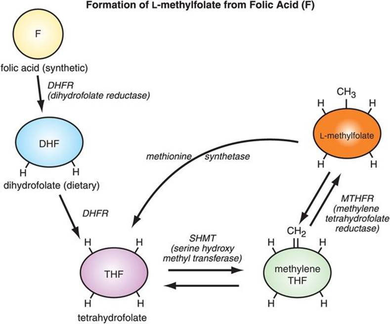 Regulates L-methylfolate levels and methylation |