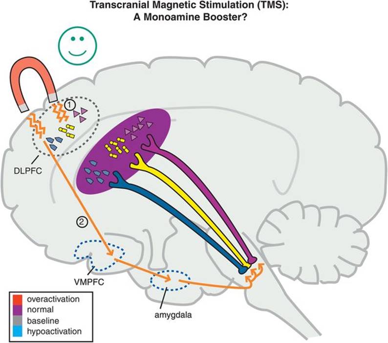 The TMS apparatus is localized in order to create an electrical impulse over the dorsolateral prefrontal cortex (DLPFC). Presumably, daily stimulation of this brain area for up to an hour over several weeks causes activation of various brain circuits that leads to an antidepressant effect (Figure 7-75). If this activates a brain circuit beginning in DLPFC, and connecting to other brain areas such as ventromedial prefrontal cortex (VMPFC) and amydgala, with connections to the brainstem centers of the monoamine neurotransmitter system, the net result would be monoamine modulation, especially for patients inadequately responsive to treatment with antidepressants (Figure 7-75, arrow 2). In this way, TMS would act through a mechanism unlike the known chemical antidepressants. However, TMS also releases neurotransmitters locally, in the area of the magnet, depolarizing them and releasing neurotransmitters from their axon terminals in the DLPFC (Figure 7-75, arrow 1). This is a second mechanism unlike chemical antidepressants, and may explain why TMS can be effective in patients who do not respond to chemical antidepressants. Finally, since all the effects of TMS are in the brain, there are no peripheral side effects such as nausea, weight gain, blood pressure changes, or sexual dysfunction. Lack of peripheral side effects plus the ability to help patients who do not respond to chemical antidepressants seem to be the particular advantages of TMS treatment of depression.