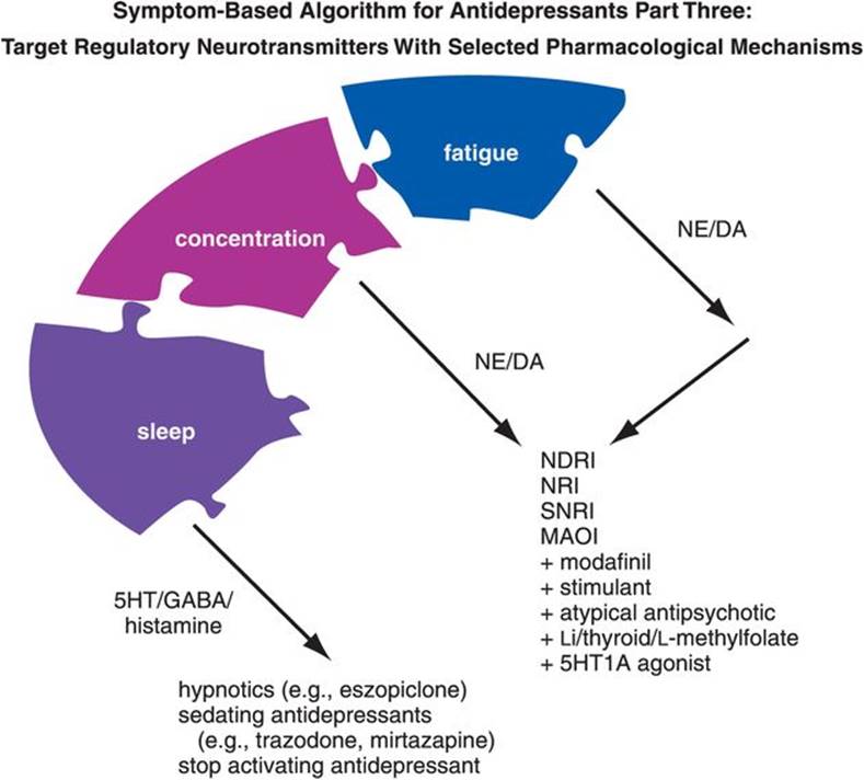 Figure 7-79. Symptom-based algorithm for antidepressants, part 3. Residual symptoms of depression can be linked to the neurotransmitters that regulate them and then, in turn, to pharmacological mechanisms. Fatigue and concentration are regulated in large part by norepinephrine (NE) and dopamine (DA), which are affected by many antidepressants, including norepinephrine–dopamine reuptake inhibitors (NDRIs), selective norepinephrine reuptake inhibitors (NRIs), serotonin–norepinephrine reuptake inhibitors (SNRIs), and monoamine oxidase inhibitors (MAOIs). Augmenting agents that affect NE and/or DA include modafinil, stimulants, atypical antipsychotics, lithium, thyroid hormone, L-methylfolate, and serotonin (5HT) 1A agonists. Sleep disturbance is regulated by 5HT, γ-aminobutyric acid (GABA), and histamine and can be treated with sedative hypnotics, with sedating antidepressants such as trazodone or mirtazapine, or by discontinuing an activating antidepressant.