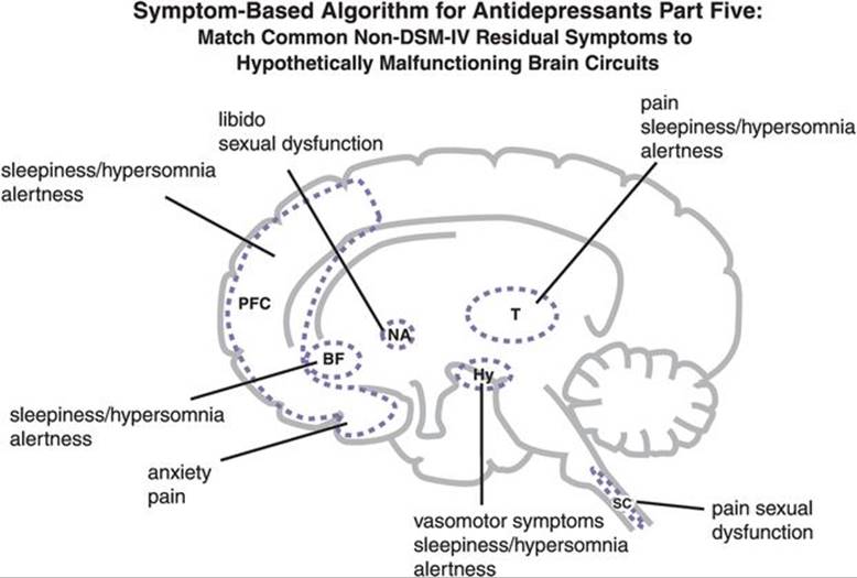 Figure 7-81. Symptom-based algorithm for antidepressants, part 5. In this figure common residual symptoms of major depression that are not part of formal diagnostic criteria are linked to hypothetically malfunctioning brain circuits. Painful physical symptoms are linked to the spinal cord (SC), thalamus (T), and ventral portions of the prefrontal cortex (PFC), while anxiety is associated with the ventral PFC. Vasomotor symptoms are mediated by the hypothalamus (Hy) and sexual dysfunction by the SC and nucleus accumbens (NA). Sleep symptoms that are part of the diagnostic criteria of depression involve mostly insomnia, linked to the hypothalamus; however, shown here are problems with hypersomnia and excessive daytime sleepiness, which may be beyond those symptoms included in the diagnostic criteria and be linked to problems with arousal and alertness and to arousal pathways not only in the hypothalamus but also the thalamus (T), basal forebrain (BF), and prefrontal cortex (PFC).