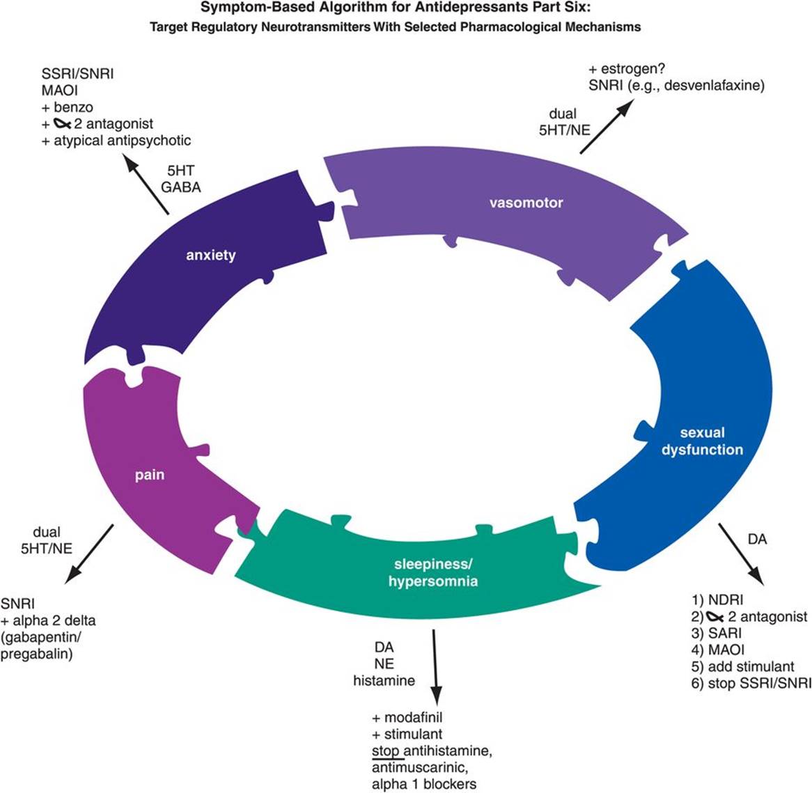 Figure 7-82. Symptom-based algorithm for antidepressants, part 6. Residual symptoms of depression can be linked to the neurotransmitters that regulate them and then, in turn, to pharmacological mechanisms. Painful physical symptoms are mediated by norepinephrine (NE) and to a lesser extent serotonin (5HT) and may be treated with serotonin–norepinephrine reuptake inhibitors (SNRIs) or α2δ ligands (pregabalin, gabapentin). Anxiety is related to 5HT and γ-aminobutyric acid (GABA); it can be treated with selective serotonin reuptake inhibitors (SSRIs), SNRIs, or monoamine oxidase inhibitors (MAOIs) as monotherapies, as well as by augmentation with benzodiazepines, α2 antagonists, or atypical antipsychotics. Vasomotor symptoms may be modulated by NE and 5HT and treated with SNRIs; augmentation with estrogen therapy is also an option. Sexual dysfunction is regulated primarily by dopamine (DA) and may be treated with norepinephrine–dopamine reuptake inhibitors (NDRIs), α2antagonists, serotonin 2A antagonist/reuptake inhibitors (SARIs), MAOIs, addition of a stimulant, or by stopping an SSRI or SNRI. Hypersomnia and problems with arousal and alertness are regulated by DA, NE, and histamine and can be treated with activating agents such as modafinil or stimulants, or by stopping sedating agents with antihistamine, antimuscarinic, and/or α1 blocking properties.
