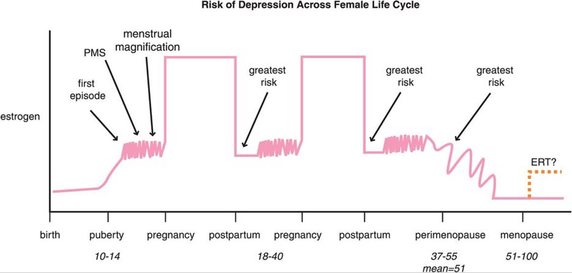 Figure 7-83. Risk of depression across the female life cycle. Several issues of importance in assessing women’s vulnerability to the onset and recurrence of depression are illustrated here. These include first onset in puberty and young adulthood, premenstrual syndrome (PMS), and menstrual magnification as harbingers of future episodes or incomplete recovery states from prior episodes of depression. There are two periods of especially high vulnerability for first episodes of depression or for recurrence if a woman has already experienced an episode: namely, the postpartum period and the perimenopausal period. ERT, estrogen replacement therapy.