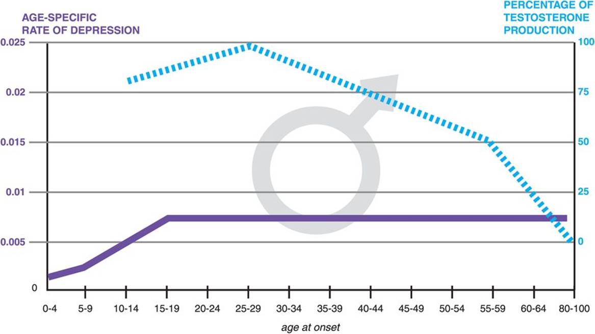 Figure 7-84. Incidence of depression across the male life cycle. In men, the incidence of depression rises in puberty and then is essentially constant throughout life, despite a slowly declining testosterone level from age 25 onward.