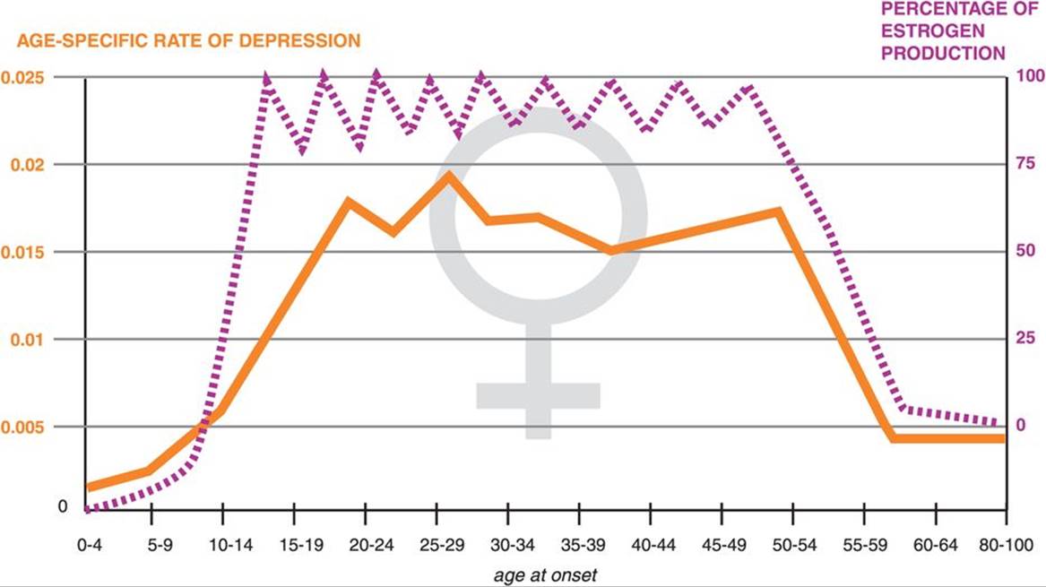 Figure 7-85. Incidence of depression across the female life cycle. The incidence of depression in women mirrors their changes in estrogen across the life cycle. As estrogen levels rise during puberty, the incidence of depression also rises; it falls again during menopause, when estrogen levels fall. Thus before puberty and after menopause, women have the same frequency of depression as men (Figure 7-84). During their childbearing years, however, when estrogen is high and cycling, the incidence of depression in women is 2–3 times as high as it is in men (Figure 7-84).